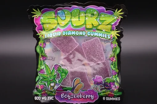 Sourz Liquid Diamond Gummies Boysenberry are typically packaged in colorful, eye-catching pouches or tubs. The packaging often reflects the fruity nature of the product, with bold colors and glossy finishes that attract attention on store shelves. The resealable options help keep the gummies fresh and flavorful over time.